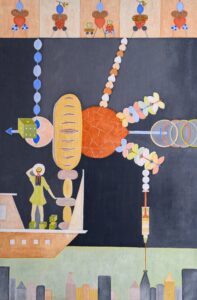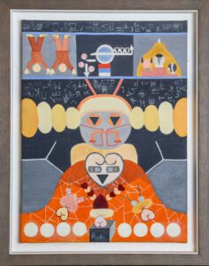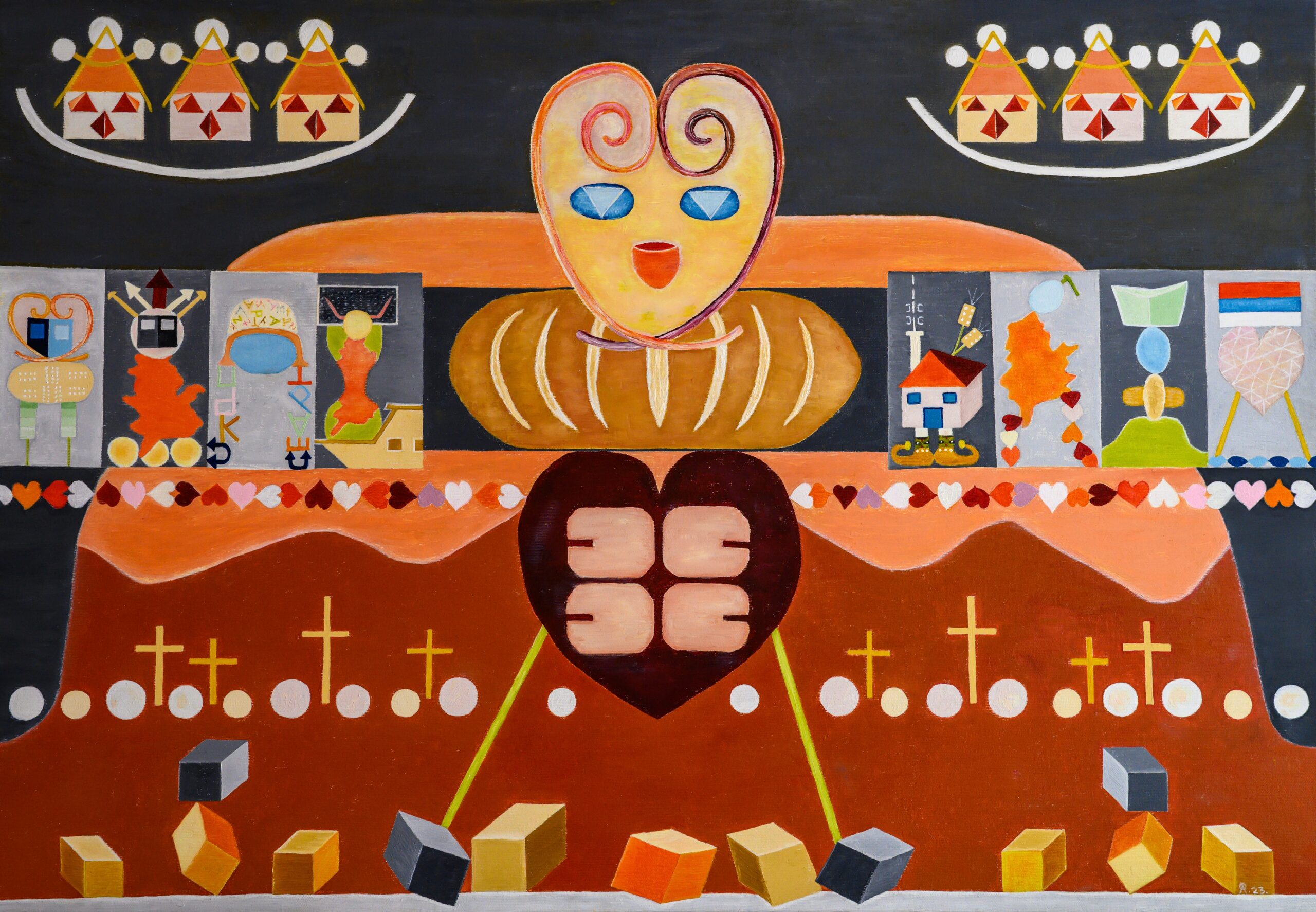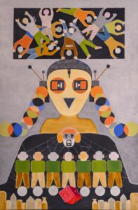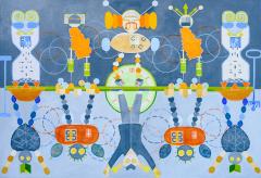 Други уметник, који нема везе са Ваљевом али нам је у мислима када видимо изложене слике, је Лазар Вујаклија који пуну стваралачку зрелост достиже када открива чари средњовековних стећака и кад надахнут њиховом иконографијом успоставља систем сопствених симбола, знакова и значења, односно постиже меру лаке препознатљивости стваралачког поступка. Захваљујући тим одликама Вујаклија се сврстао у ред најбољих сликара, модерних традиционалниста друге половине 20.века.[1] Лазаревићеву уметност можемо директно да надовежемо на Вујаклијину јер он прави своју савремену симболику. Његове фигуре су деперсонализоване, сведене на знак, готово на пиктограм. Ликовни елементи у његовим сликама су постали идеограми његове уметности. Уобичајено је да је централни лик на сликама робот или хибрид који делује као хладна алегорија моћи. Он не командује гестом већ структуром: мрежама, низовима, ритмом понављања. Све нас упућује на то да је савремени свет завистан од технологије, фигуре су као уметникови савременици алгоритамски повезани, технологија у различитим облицима нам ствара привид блискости која је дигитална а не стварна. Приказ робота је синоним за колективну свест и свет у којем се контрола не спроводи насиљем већ обрасцем. Са друге стране имамо слике које су засноване на стилизованом ликовном језику који црпи снагу из народне уметности и колективног памћења. Анонимне фигуре, сведене и ритмично понављане, постају носиоци општих, трајних вредности заједнице. Срца (лицидерска понекад) симболизују љубав, обредност и духовну размену а хлеб представља архетип живота, рада и гостољубивости. Њихово заједничко присуство на неким сликама наглашава склад материјалног и духовног, као суштину традиционалног света.