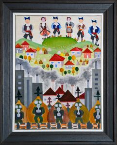 У Лазаревићевој слици Има наде село и традиција лебде над брежуљком као успомена на миран, свет који се губи у диму индустрије која полако гуши тај идилични ритам. Радници у маскама, униформисани и анонимни, стоје фронтално, као протагонисти дистопијског приказа загађености савременог друштва, а њихове фабрике и црквени симболи подсећају да ни дух ни тело не могу остати неоштећени. Наиван, готово дечји ликовни језик појачава оштрину симбола, претварајући сцену у филмски кадар алегорије судара наслеђа и модерности, тихе трагедије рада и опстанка. Назив дела нам буди оптимизам, као што је победник увек на врху тако је и смисао живота да се вратимо природи, селу и коренима.